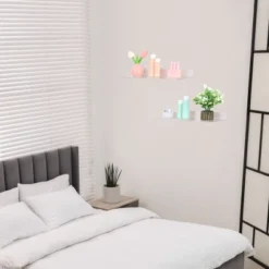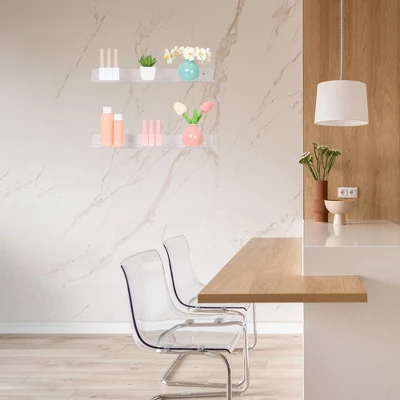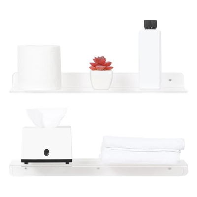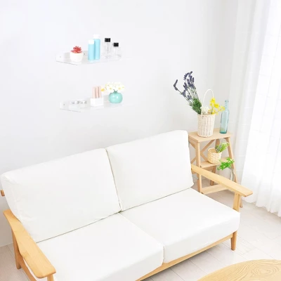 These floating shelves are crafted from thick acrylics with smooth edges. The thickness of the material ensures sturdy support for your items. You can blend seamlessly into many spaces including the living room, kitchen, home office, bathroom, bedroom and so on. One set can be split up and installed in different areas, giving you the flexibility to plan shelf organization to work for your unique space. Easily mount the bathroom shelves on drywall, and concrete walls using the included mounting hardware just in a few minutes by yourself.
