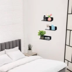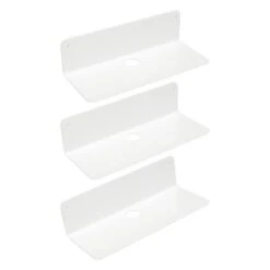 Description: The floating shelves are crafted from thick acrylics with smooth edges. The thickness of the material ensures sturdy support for your items. The shelves are good for organizing small items and keeping them neat. It makes full use of the wall and lets your bedroom and bathroom look more concise and beautiful. You can blend seamlessly into many spaces including the living room, kitchen, home office, bathroom, bedroom, and so on. One set can be split up and installed in different areas, giving you the flexibility to plan shelf organization to work for your unique space. Easily mount the bathroom shelves on drywall, and concrete walls using the included mounting hardware just in a few minutes by yourself.