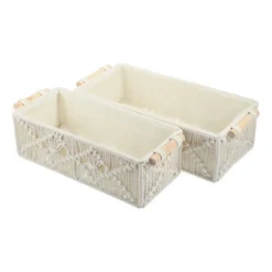 Item Function: 1. All the miscellaneous things in daily life can be put in this basket for storage. 2. Hand woven basket for organizing your hand towels, toiletries, magazines. 3. Sturdy design, this storage bins is all handmade with cotton rope custom. Product Name: Storage Baskets, Material: Wood, Cotton, Size 1: 36.5x17x10cm/14.37″x6.69″x3.94″(L*W*H), Size 2: 33.5×13.5x10cm/13.19″x5.31″x3.94″(L*W*H). Package List: 1x Big Storage Basket. 1x Small Storage Basket.
