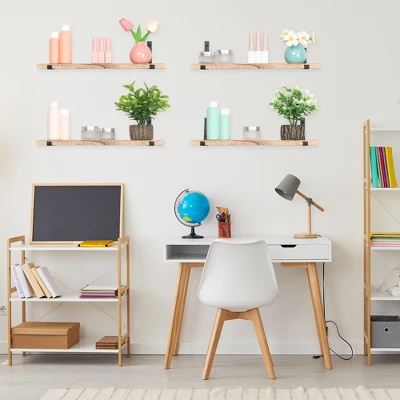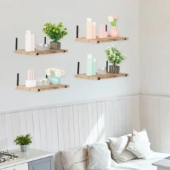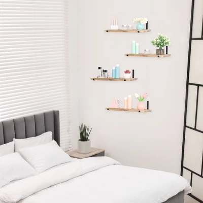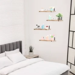 Description: These floating shelves are crafted from wood, which is resistant to warping and cracking. The strong wood ensures sturdy support for your items while the wood texture can add a touch of character to any room. Maximize storage of decorative shelves by reducing clutter, and highlighting wall decor in compact spaces. The floating shelves for walls are suitable for any style of home and studio apartment, as well as wall decor for bedrooms, kitchens, living rooms, bedrooms, offices, study rooms, etc. It is good for organizing small items and keeping them neat. One set can be split up and installed in different areas, giving you the flexibility to plan shelf organization to work for your unique space. Easily mount the bathroom shelves on drywall, and concrete walls using the included mounting hardware just in a few minutes by yourself.