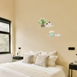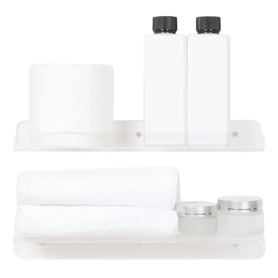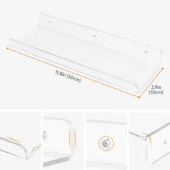 These floating shelves are crafted from thick acrylics with smooth edges. The thickness of the material ensures sturdy support for your items. You can blend seamlessly into many spaces including the living room, kitchen, home office, bathroom, bedroom and so on. One set can be split up and installed in different areas, giving you the flexibility to plan shelf organization to work for your unique space. Easily mount the bathroom shelves on drywall, and concrete walls using the included mounting hardware just in a few minutes by yourself.