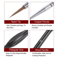 Descriptions: 1. The brush head is made of nylon bristles, has good elasticity, does not easily fall hair, has a soft texture, smooth brush stroke, strong water absorption, easy and convenient to dip paint. Metal copper sleeve Ferrule, firm pen tip, no shaking while painting. 2. The handle is made of birch wood, protected by U-V coating, designed as an easy-to-grip triangular prism, and feels comfortable and safe when holding the pen. 3. Just clean the brush with solvent or warm water immediately after use and straighten the brush head upright in a cool dry place to dry. Do not touch the brush head with other objects to prevent deformation of the brush head. 4. The fine detail painting brushes are suitable for watercolor painting, acrylic painting, ink painting, gouache painting, oil painting, ceramic painting, industrial painting, etc., and can be used for models, detailing, body, face, nails, art, illustration, and rendering, etc, for beginners, artists or anyone like painting. Notice: 1. When you use it for the first time, it is normal to lose a little hair slightly, please understand. 2. Gently rub the bristles with your hands before use, and then soak the pen tip in warm water at about 30 degrees for about 2 minutes. 3. Non-oil-based paintings such as gouache, watercolor, and tracing can be washed with warm water. Oil paintings, acrylics, nail art, and colored paintings need to be cleaned with turpentine or solvent.