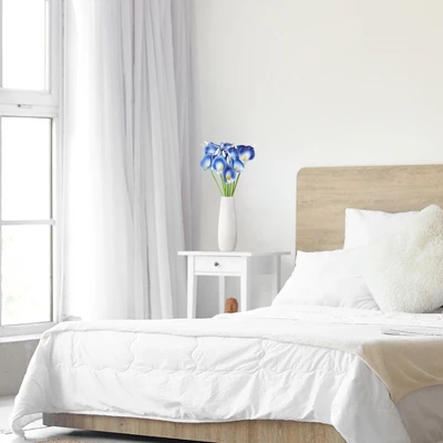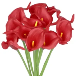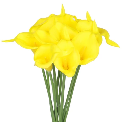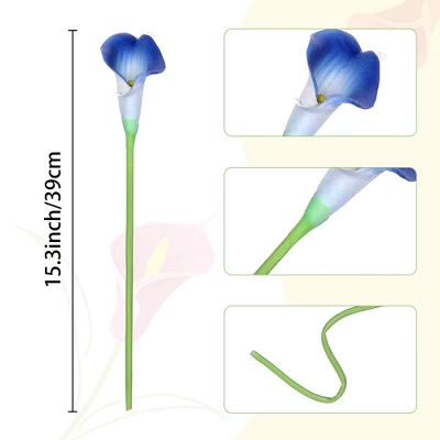 These artificial calla lily flowers are hand-made, exquisite, and beautiful, making them ideal for weddings, showers, parties, and outdoor decorations. They add color to any room and are crafted from durable polyurethane and plastic materials that do not fade even when washed. The flowers are strong enough to withstand pulling and can endure high temperatures, making them safe for indoor use. Each bouquet consists of 12 stems with long slender green stems, providing a romantic and artistic feel. The artificial flowers are forever fresh and require minimal maintenance, with any deformation during shipping easily adjustable by hand.