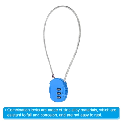 The small combination lock is mainly used for lockers, doors, bags, drawers, suitcases, bicycles, and other places you need to lock, whether at home, gym, or when traveling. Specifications: Material: Zinc Alloy, Steel;Steel Rope Stretched Length: 30cm / 11.8 inch;Steel Rope Diameter: 3mm / 0.12 inch;Lock Height: 40mm / 1.57 inch;Advantage: These combination locks are made of zinc alloy materials, which are resistant to fall and corrosion and are not easy to rust. 3-digit combination padlock design, easy to remember, up to 1000 sets of password combinations, not easy to be cracked. Instruction: 1. The lock is preset at the factory to open at 0-0-0. check the 0-0-0 aim at the indication line. Press down the snap. Now the lock is ready to open.2. Press down the button with a tool, and hold the position until the next step3. Turn the character wheels to set your personal combination.4. Release the button, now your new combination is set.5. Remember well your new combination. If you want to change it again, please repeat. Notice: Please place the password wheel on the right hand side to complete unlocking and password setting.