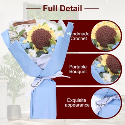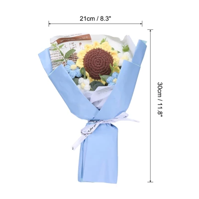 This crochet flower bouquet is a handmade knitted arrangement featuring both large and small crochet flowers, leaves, and exquisite purses. Crafted to resemble natural sunflowers, each piece is 100% knitted by hand, showcasing a vibrant color palette and unique craftsmanship. These artificial flowers are made from cotton yarn and built-in wire, making them low-maintenance and ideal for long-lasting decorations. Perfect for various occasions such as Mother’s Day, birthdays, weddings, and graduation ceremonies, this bouquet can enhance the visual appeal of your celebrations. To keep the crochet flowers looking beautiful, gently dust them with a soft cloth when needed and handle them with care to preserve their delicate craftsmanship.