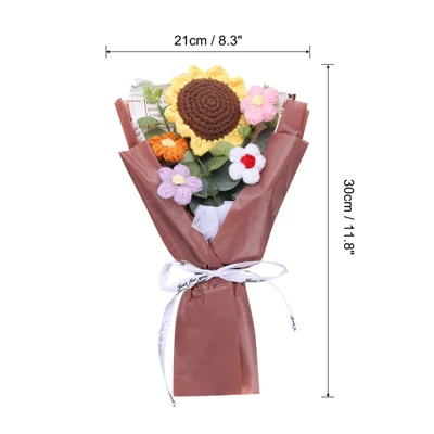 This crochet flower bouquet is a handmade knitted arrangement featuring both large and small crochet flowers, leaves, and exquisite purses. Crafted to resemble natural sunflowers, each piece is 100% knitted by hand, showcasing a vibrant color palette and unique craftsmanship. These artificial flowers are made from cotton yarn and built-in wire, making them low-maintenance and ideal for long-lasting decorations. Perfect for various occasions such as Mother’s Day, birthdays, weddings, and graduation ceremonies, this bouquet can enhance the visual appeal of your celebrations. To keep the crochet flowers looking beautiful, gently dust them with a soft cloth when needed and handle them with care to preserve their delicate craftsmanship.