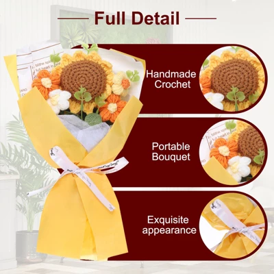 This crochet flower bouquet is a handmade knitted arrangement featuring both large and small crochet flowers, leaves, and exquisite purses. Crafted to resemble natural sunflowers, each piece is 100% knitted by hand, showcasing a vibrant color palette and unique craftsmanship. These artificial flowers are made from cotton yarn and built-in wire, making them low-maintenance and ideal for long-lasting decorations. Perfect for various occasions such as Mother’s Day, birthdays, weddings, and graduation ceremonies, this bouquet can enhance the visual appeal of your celebrations. To keep the crochet flowers looking beautiful, gently dust them with a soft cloth when needed and handle them with care to preserve their delicate craftsmanship.