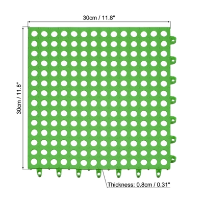 What is this?This interlocking cushion can be freely spliced according to the size of the site, and has the functions of anti-slip drainage and landscape decoration and beautification. Widely used in swimming pools, parks, playground, balconies, gardens, courtyards, bathroom, etc..What will I get?The interlocking cushion, we provide here, is in the size ofIs there any advantages of the product?Made of PVC material, heat and cold resistance, strong flexibility, strong and durable. The hole of the floor mat is large, and the drainage is fast and not easy to block. There are several small cylinders to hold up the cushion, which is not easy to deform and accumulate water, effectively block water and keep the ground dry.How to use it?Easy to use, just snap the cylinder of the bottom firmly into the edge buckle.What should I notice?Please read the measurements before ordering if you are concerned about the size.