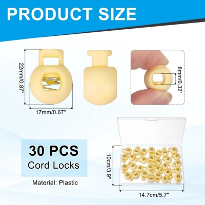 The drawstring clamp is used for finishing cord ends to prevent the rope from slipping. They are great for camping, hiking, and a multitude of other applications, such as drawstrings, shoelaces, lanyards, pants closures, paracord strings, luggage tags, backpacks, tents, and various outdoor and gym equipment. These cord locks to your DIY craft needs. Cord locks for drawstrings are made of plastic material, have smooth surfaces, and lightweight, not easy to break or rust, and can be used for a long time. The cord lock is a spring-loaded design that provides great flexibility, allows for quick and easy release while keeping your cord securely tightened, and comes with a box for easy storage. To use the plastic cord locks, simply press the top to thread the rope through the spring hole. Upon releasing the top, the paracord lock securely holds the rope in place. By pressing the top again, you can adjust the desired length as needed (Ropes are not included). Please confirm the hole diameter before ordering.