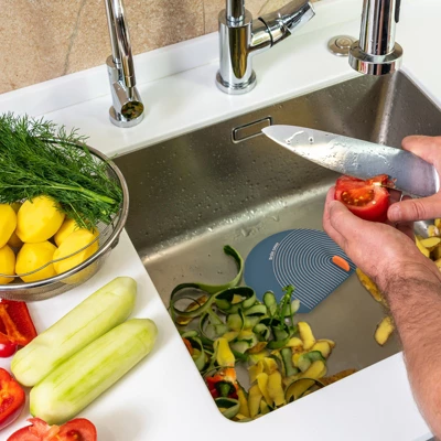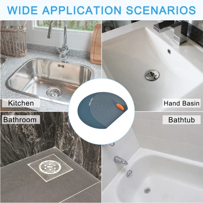 The floor drain cover is constructed from durable silicone material, ensuring longevity without unwanted odors. It maintains its shape and does not deform over time. The soft silicone adapts to various corners, providing a seal between the water sink and floor drain for multiple uses. These bath drain mats are designed to fit snugly in corners and cover drain openings effectively. Suitable for kitchens, bathrooms, and other areas, they prevent water leakage and odors from escaping. The smooth surface of the silicone cover allows for easy cleaning with a simple rinse using a faucet. Featuring a buckle design, this drain cover offers convenient storage options when not in use. The water-sink drain stopper boasts strong adsorption, ensuring stability and slip resistance to keep it securely in place.