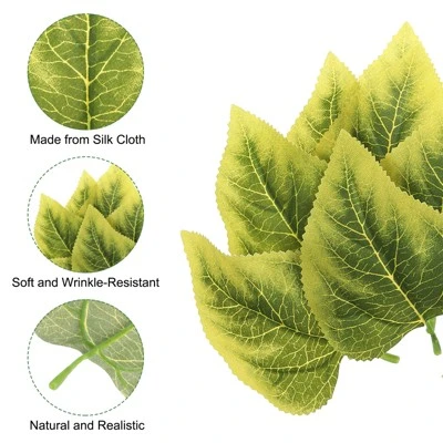 These artificial silk leaves are ideal for enhancing flower arrangements, crafting wedding bouquets, wreaths, DIY projects, and home party decorations. They can be used as ornaments on bedside tables, desks, and living room shelves, adding sophistication and elegance to any space. Made from silk cloth with a shiny appearance, these leaves feature a wrinkle-resistant texture that maintains their look without fading or withering. Their natural and realistic appearance makes them perfect for flower arrangements, home decor, or arts and crafts, providing an easy way to bring freshness and life into any setting. The leaves include a wire inset to keep them upright, allowing them to be paired with any flower for a bouquet or placed alone in a vase for decoration. Handle with care to maintain their lifelike appearance, and note that there may be slight color variations due to lighting and display differences.