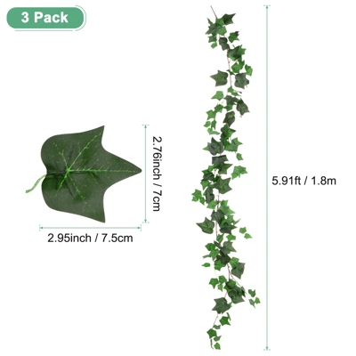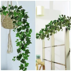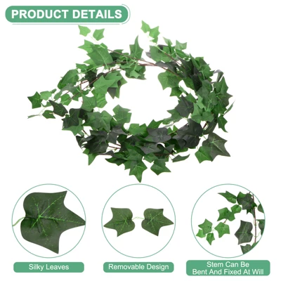 The artificial ivy vines kit offers a versatile decoration solution suitable for various occasions, including family living rooms, studies, offices, shop windows, and wedding scenes. These green vines create a natural and comfortable atmosphere. Made from selected silk cloth, the leaves are firm, clear in texture, soft to the touch, and deep in color, giving them a lifelike appearance. The plastic stems are easy to bend and cut, allowing for flexible installation. Unlike real plants, these wall-hanging plants do not require watering or pruning, are easy to clean, UV-resistant, and maintain their vibrant color for a long time, making them ideal for busy individuals. The fake ivy leaf garland can be cut and customized to create a simulated and private environment as per your needs.