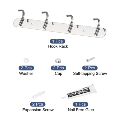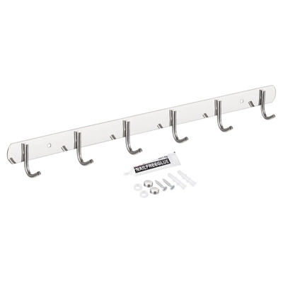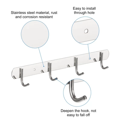 This wall-mounted coat hook rack is crafted from high-strength 201 stainless steel, ensuring durability and resistance to rust and corrosion. Its sleek, polished finish provides a smooth surface that won’t ruin clothes or bags. Designed for versatility, it can securely hold a variety of items such as bags, pants, skirts, coats, hats, scarves, towels, umbrellas, and keys. Suitable for use in bedrooms, living rooms, bathrooms, cloakrooms, kitchens, and more, this hook rack is ideal for home, office, shop, or hotel settings. Easy to install, it comes with screws and dowels for mounting on drywall or plaster walls, making organization simple and efficient.