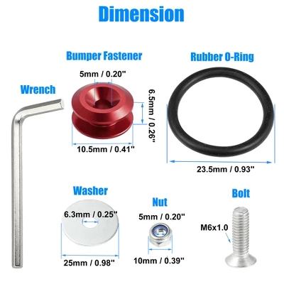 Feature: Universal suit for most vehicles front rear bumpers. Easy to install without instructions. Made of sturdy aluminum alloy and quality rubber, durable and not easy to crack. Simple design, quick release bumper fastener use to fi x car bumpers to avoid of falling off again and improves your vehicle’s styling. Installation Steps: Remove the inner fender clips along the side to get access to the back of the bumper easier. Mark the hole position where you will install then drill the holes. Install the fastener and put the rubber band in the normal way or cross. Tighten the back fender nuts, finished. Specifications: Color: Red, Black, Silver Tone; Material: Steel, Rubber; Bumper Quick Release Tabs Size: 23.5mm / 0.93″(D); Bumper Quick Release Tabs Inner Diameter Size: 6.5mm / 0.26″(D); Washers Size: 25mm / 0.98″(D); Washers Inner Diameter Size: 6.3mm / 0.25″(D); Nuts Size: 10mm / 0.39″(W); Nuts Inner Diameter Size: 5mm / 0.20″(D); Stainless Steel Bolts Size: M6x1.0; Rubber O-Rings Size: 57mm / 2.24″(D); Package Included: 4 x Bumper Quick Release Tabs; 4 x Bolts; 4 x Screw; 4 x Washers; 12 x Rubber O-Rings; 1 x Wrench.